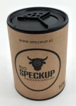 Speckup ist 97 Prozent geriebener und geräucherter Rinderspeck, der Rest: Natursalz, Wacholderbeeren, Kümmel, Pfeffer, Majoran, Lorbeerblätter, Knoblauch und natürlicher Rauch.
