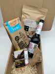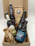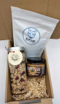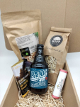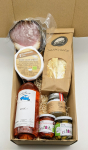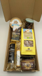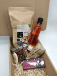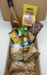 Karton mit Holzwolle, Karte und Dekoration mit Schild. Fülle die Schachtel mit Produkten deiner Wahl.